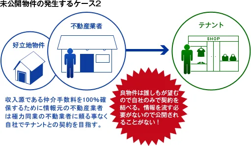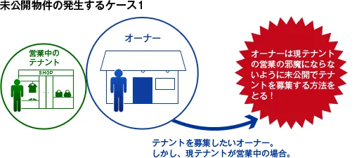 このため、閉店する時は少しでも負担を減らすために営業したまま新しい借り手を探すのですが、お店が営業している以上、おおっぴらに借り手を探すわけにはいきません。そこで、一部の不動産業者にだけ秘密裏に物件情報を流します。これが未公開物件となるパターンのひとつです。