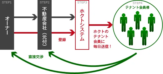 ホクトシステムは不動産業者ではありませんので、物件の仲介は行いません。あくまで会員の皆様からいただく料金で運営している「情報提供サービス」です。このため、店舗物件を貸したい管理会社はホクトシステムでテナントを見つけても仲介手数料を折半する必要がありませんので、積極的に物件情報を紹介してくれます。また、有料会員制のためインターネットに公開できない未公開物件の取り扱いが可能です。